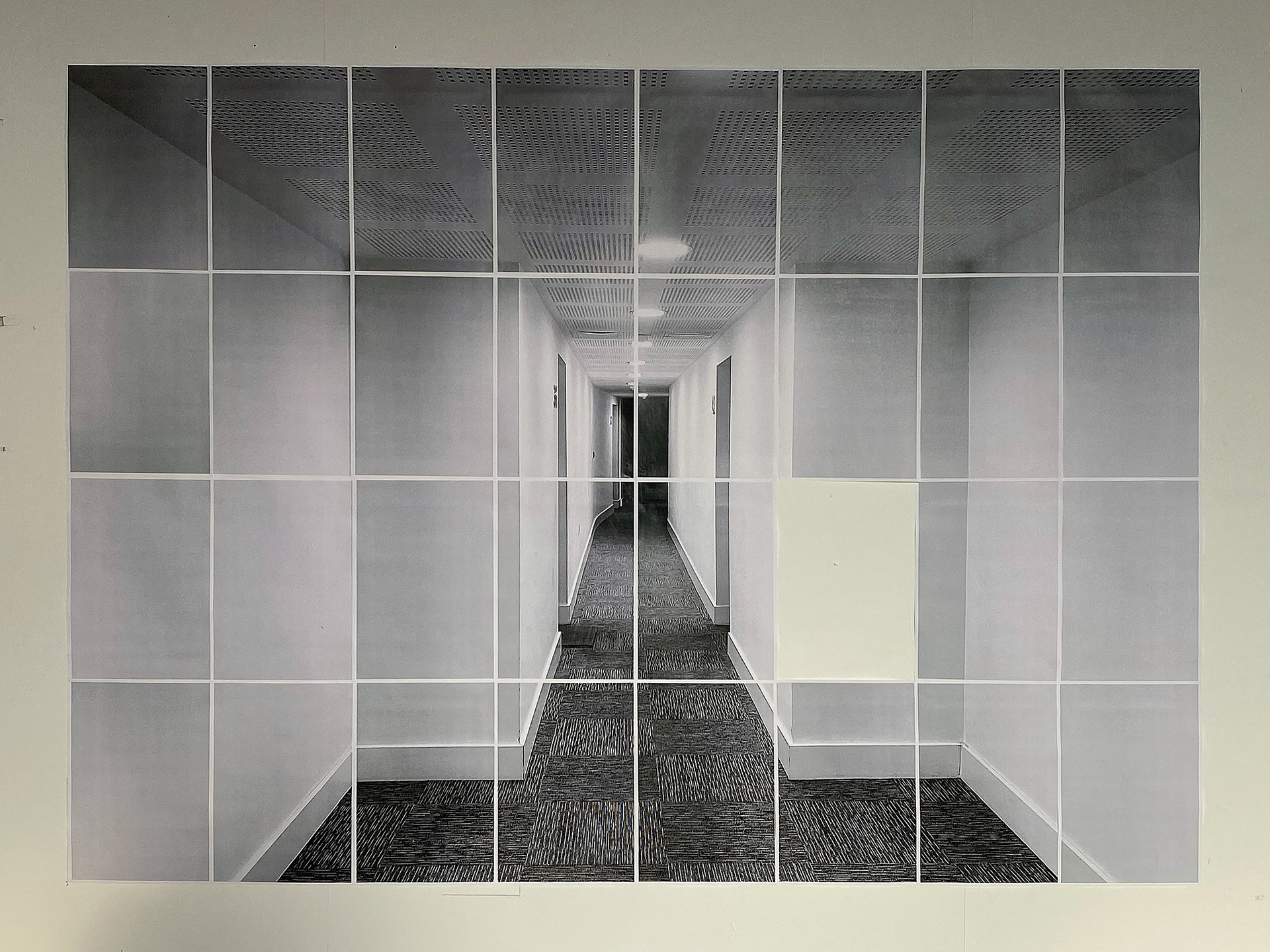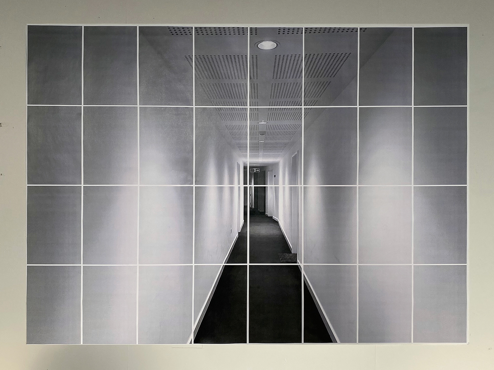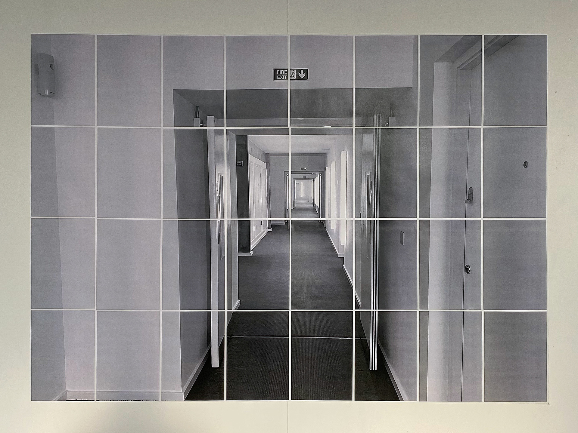 A series of wall based works – each made up of 32 sheets of A4 paper laser jet prints. The hallways depicted are connecting social housing to private housing within the same complex. Sometimes I am in the privately owned part of the building looking towards the social housing part of the corridor and sometimes I am looking towards the privately owned parts looking towards the social housing. There are subtle differences in the materials used in each, the thickness of the carpet, the veneer on the doors, the mood of the lighting. The grid is created from the restricted printing area of a Xerox laser printer. Each A4 sheet has its own unique colour, there are halo’s of noise and printer errors that make them all modulate differently creating abstractions and texture. There is a social static present within these spaces that I try to capture in each image.