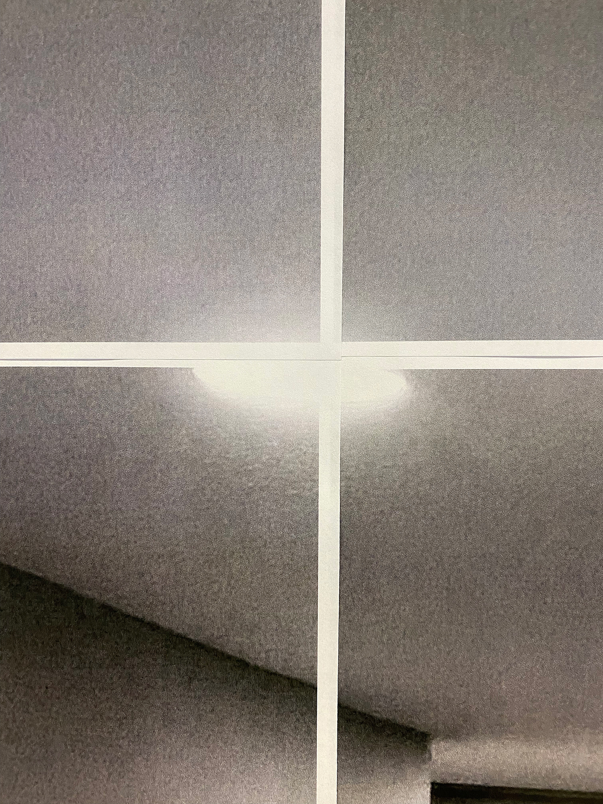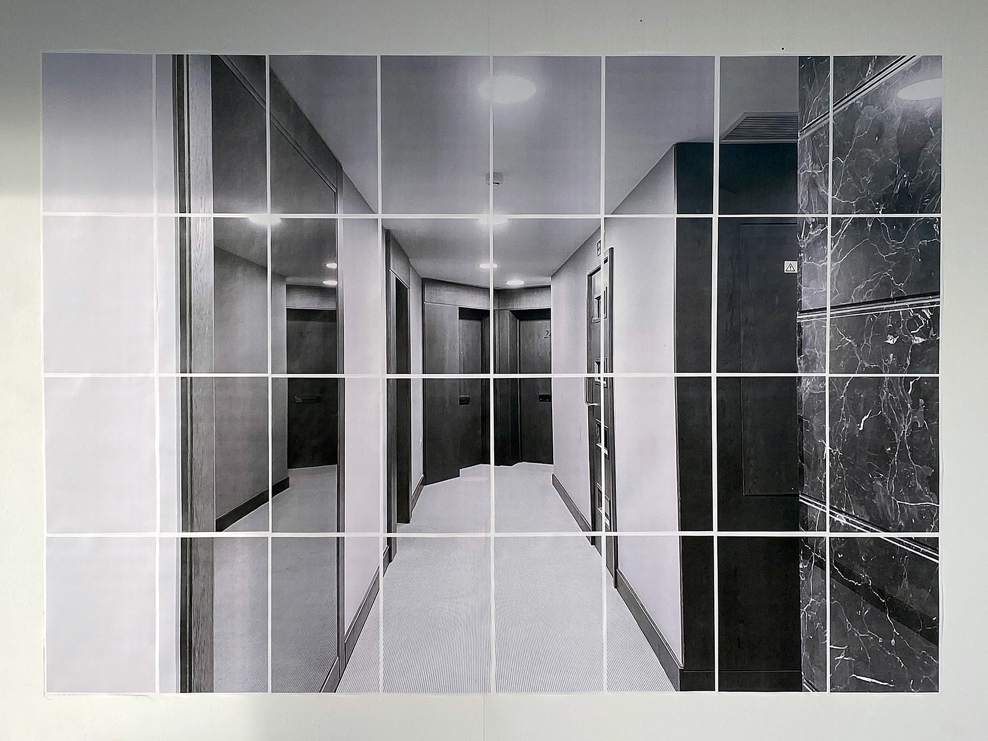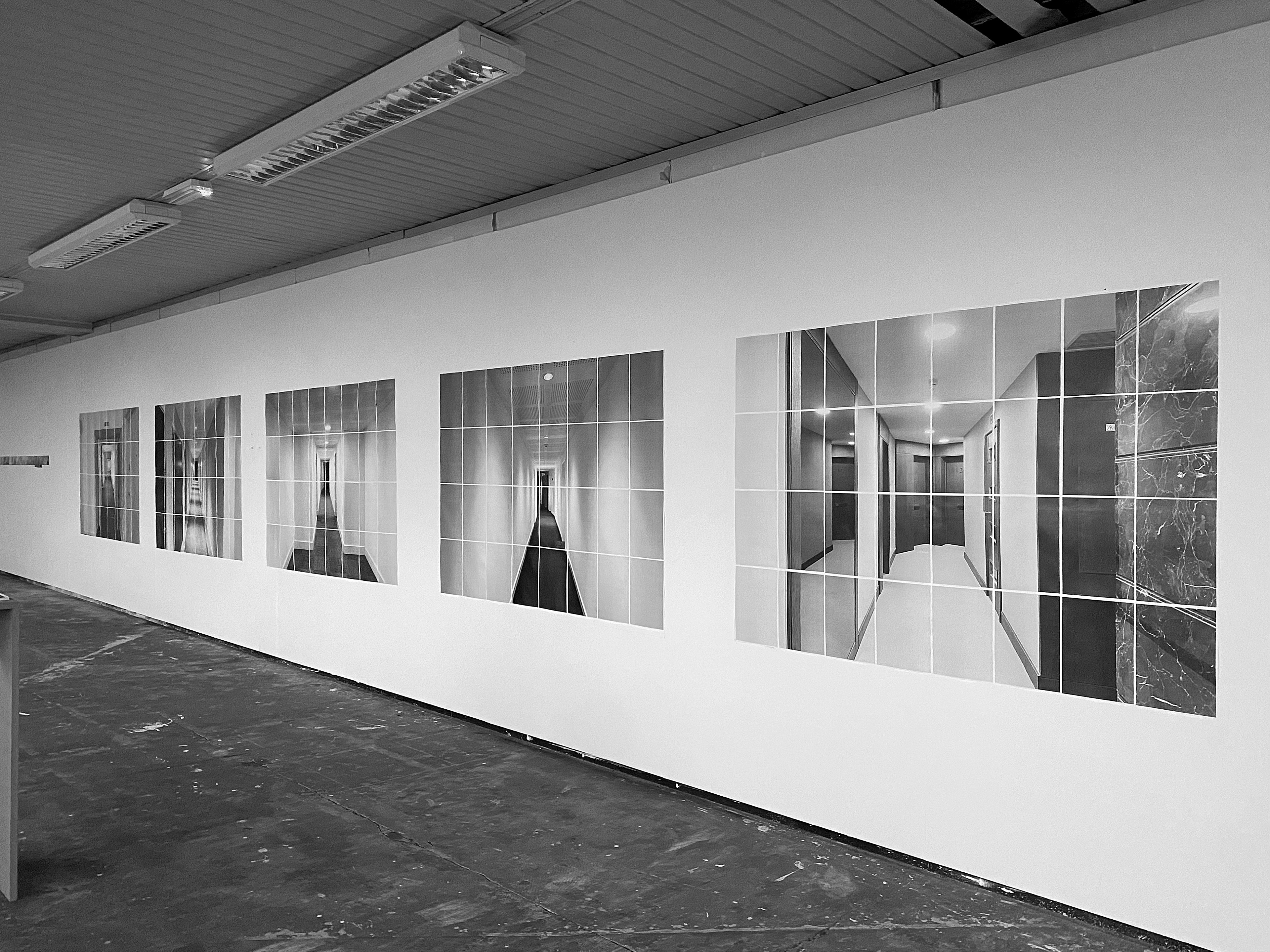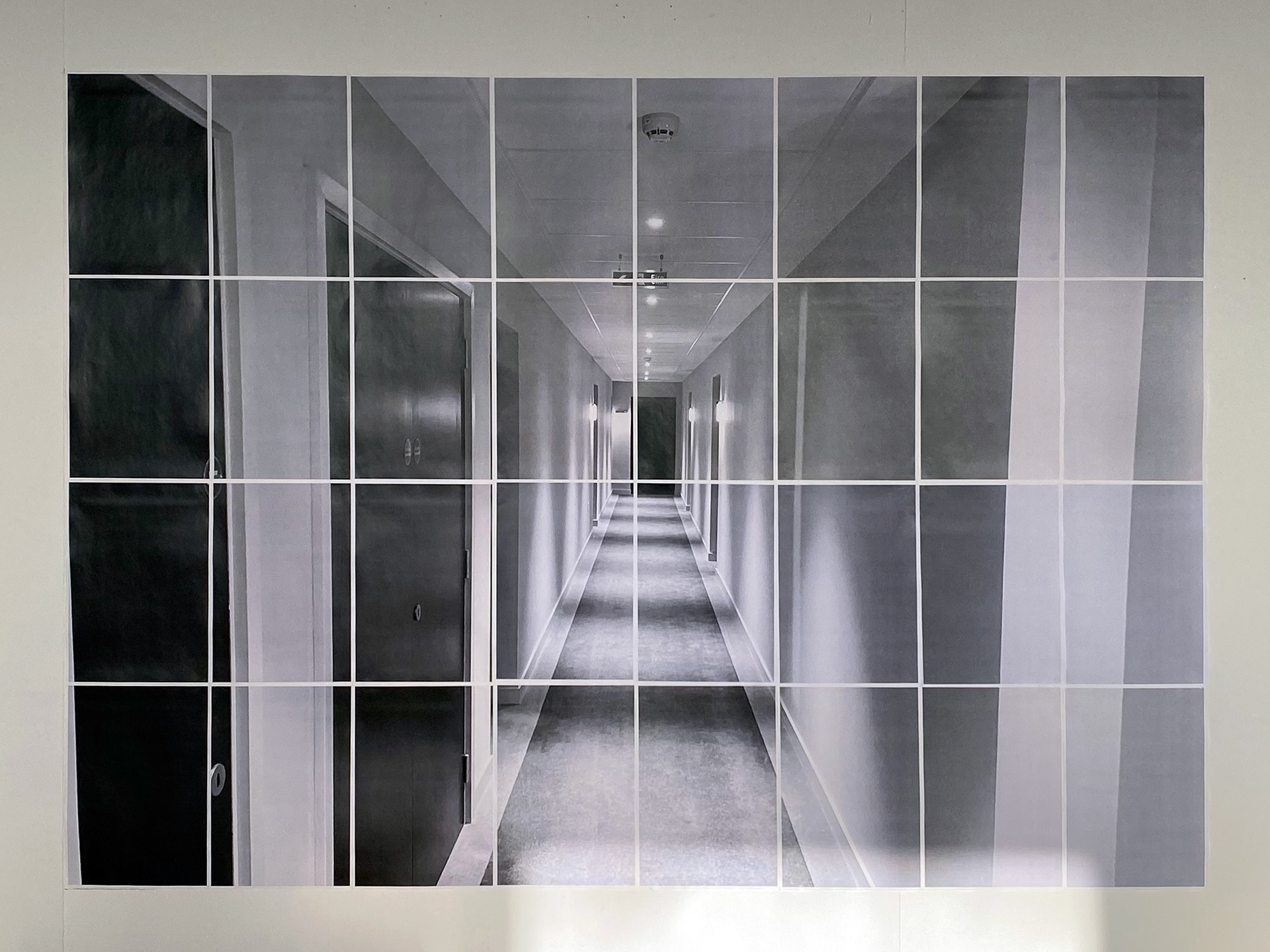 A series of wall based works – each made up of 32 sheets of A4 paper laser jet prints. The hallways depicted are connecting social housing to private housing within the same complex. Sometimes I am in the privately owned part of the building looking towards the social housing part of the corridor and sometimes I am looking towards the privately owned parts looking towards the social housing. There are subtle differences in the materials used in each, the thickness of the carpet, the veneer on the doors, the mood of the lighting. The grid is created from the restricted printing area of a Xerox laser printer. Each A4 sheet has its own unique colour, there are halo’s of noise and printer errors that make them all modulate differently creating abstractions and texture. There is a social static present within these spaces that I try to capture in each image.